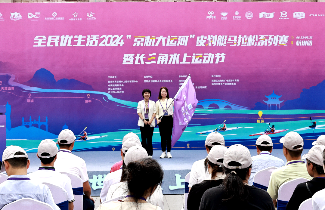 开幕式现场,中国皮划艇协会秘书长张茵为系列赛事杭州站承办地授旗。