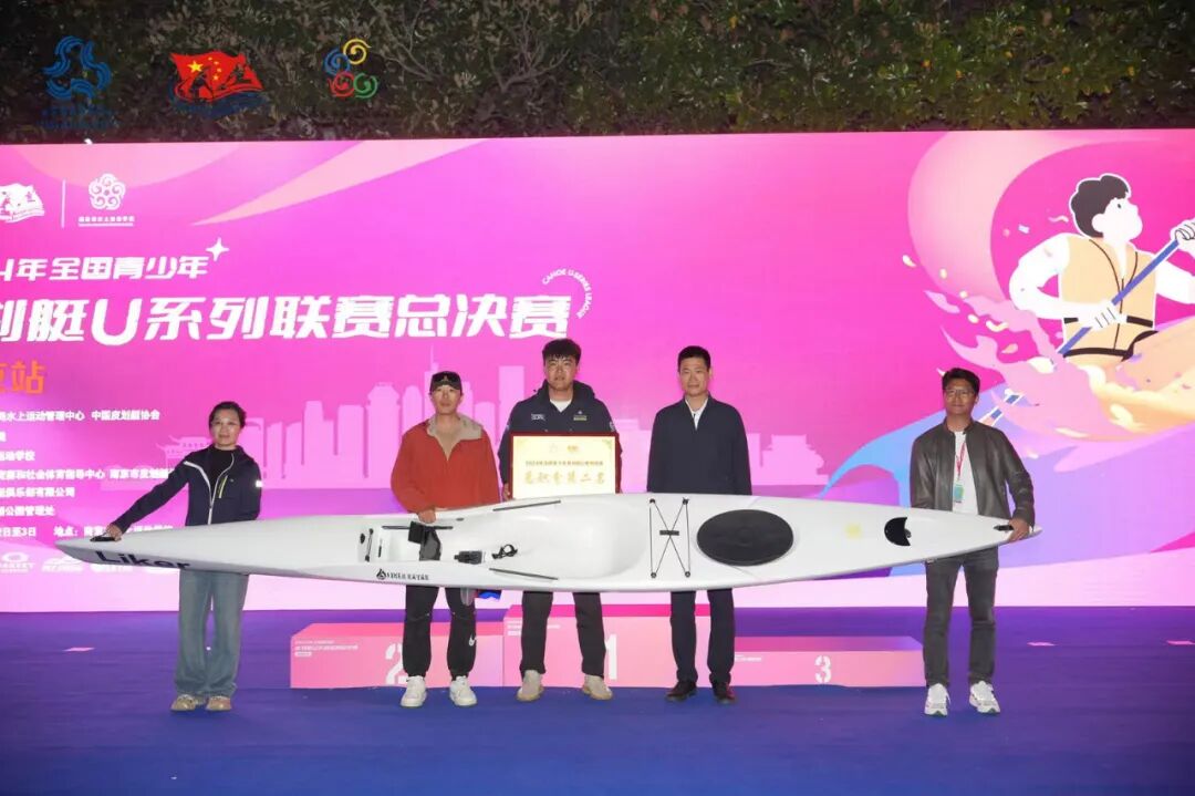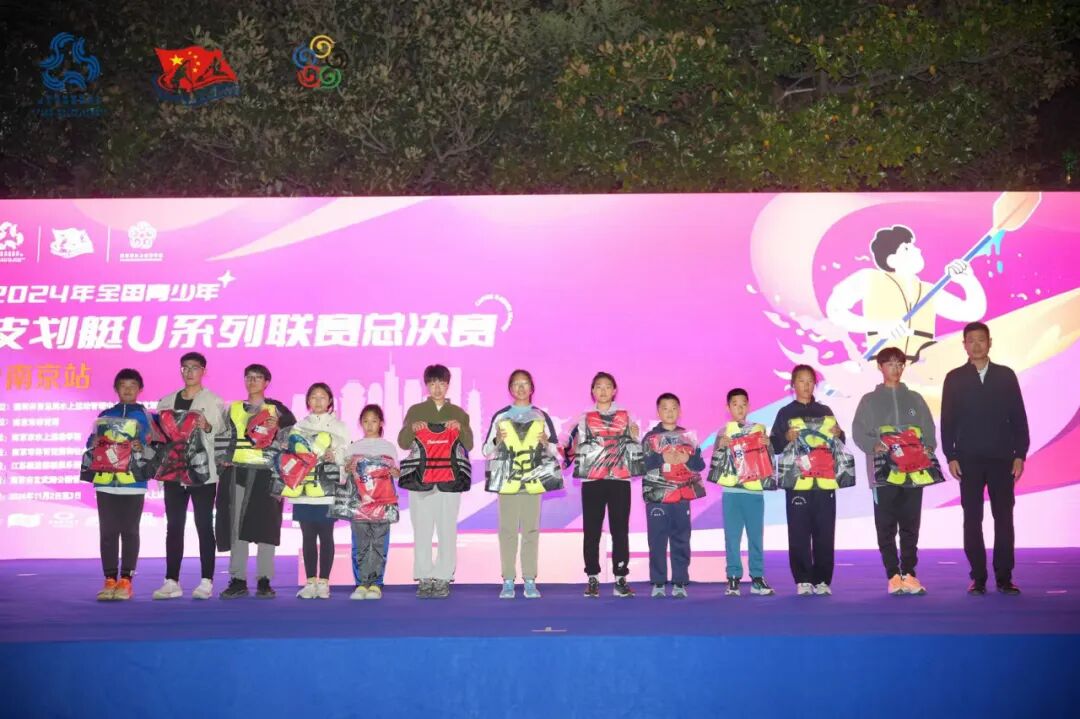 当天,在南京站分站(点击本页面下方“阅读原文”可下载本站成绩册)颁奖仪式结束后,中国皮划艇协会在南京市水上运动学校举行了2024年全国青少年皮划艇U系列联赛全年总冠军颁奖典礼。系列赛事器材合作伙伴培生船艇负责人祝培文、莱科船艇负责人王蓓蓓、上海环德事业有限公司负责人叶何友、上海倍轻松负责人于力以及中国静水国家队服装赞助商巴迪瑞负责人袁狄麟等嘉宾为年度冠军们送上了船、桨、按摩椅、救生衣、纪念衫等精美礼品。